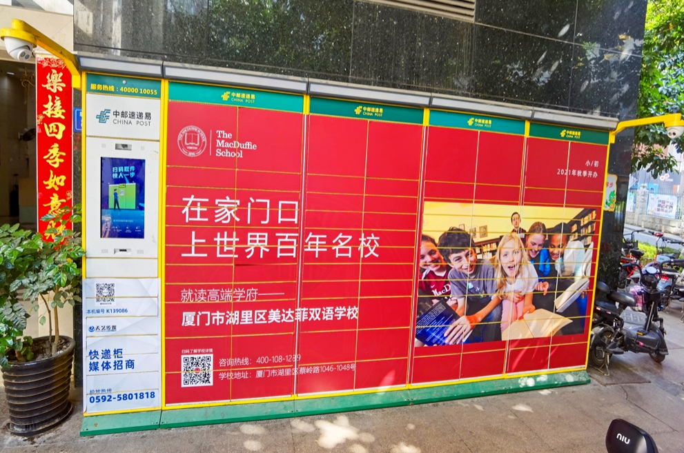 美達(dá)菲在廈門(mén)確定扎根后,重視線上線下的一系列宣傳告知,年后即開(kāi)始在廈門(mén)戶外多個(gè)渠道進(jìn)行大范圍的宣傳推廣,以“在家門(mén)口,上世界百年名校”為口號(hào),集中在五緣灣、觀音山、會(huì)展、萬(wàn)達(dá)廣場(chǎng)、蔡塘廣場(chǎng)等多個(gè)中高端商圈、商務(wù)圈,以及仙岳路、廈禾路、嘉禾路等多個(gè)主干道進(jìn)行城市路名牌的投放,同時(shí)在島內(nèi)多個(gè)高端住宅小區(qū)的快遞柜進(jìn)行大幅畫(huà)面展示。